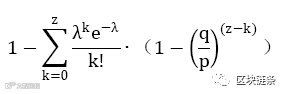 当此情形,为了计算攻击者追赶上的概率,我们将攻击者取得进展区块数量的泊松分布的概率密度,乘以在该数量下攻击者依然能够追赶上的概率。