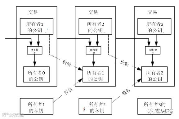 我们定义,一枚电子货币(an electronic coin)是这样的一串数字签名:每一位所有者通过对前一次交易和下一位拥有者的公钥(Public key) 签署一个随机散列的数字签名,并将这个签名附加在这枚电子货币的末尾,电子货币就发送给了下一位所有者。而收款人通过对签名进行检验,就能够验证该链条的所有者。