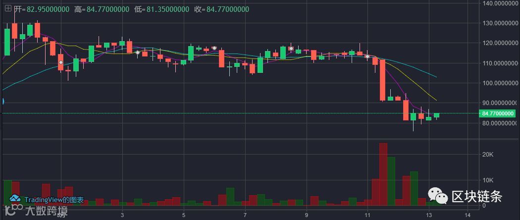 最近观察各种群,各种圈,充斥了各种哀嚎。本次上涨行情是由EOS带动起来的,现在EOS还剩十块钱就到腰斩位了,而且是在没有任何实质利空消息的情况下。很多人在质疑EOS还能走多远,还有小伙伴们挥泪割肉。(看上图,下面的柱状图是成交量,能看到跌幅最大的那天有太多人割肉了)