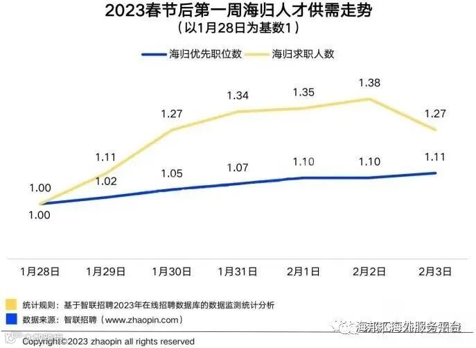 据招聘平台数据显示,2023年春节后的第一周,海归优先职位数和海归求职人数均呈现上升的趋势。