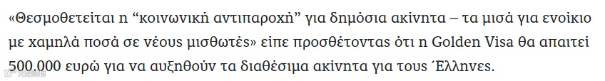然而,在当地时间9月10日下午,希腊总理米佐塔基斯在第86届塞萨洛尼基国际博览会上宣布了21项措施,旨在缓解学生、老人和弱势群体的生活压力,以及帮助改善就业问题和刺激企业的发展。其中,有一条措施是:授予黄金签证许可证的投资限额从25万欧元增加到50万欧元,此举措以增加希腊人的可用房地产数目。