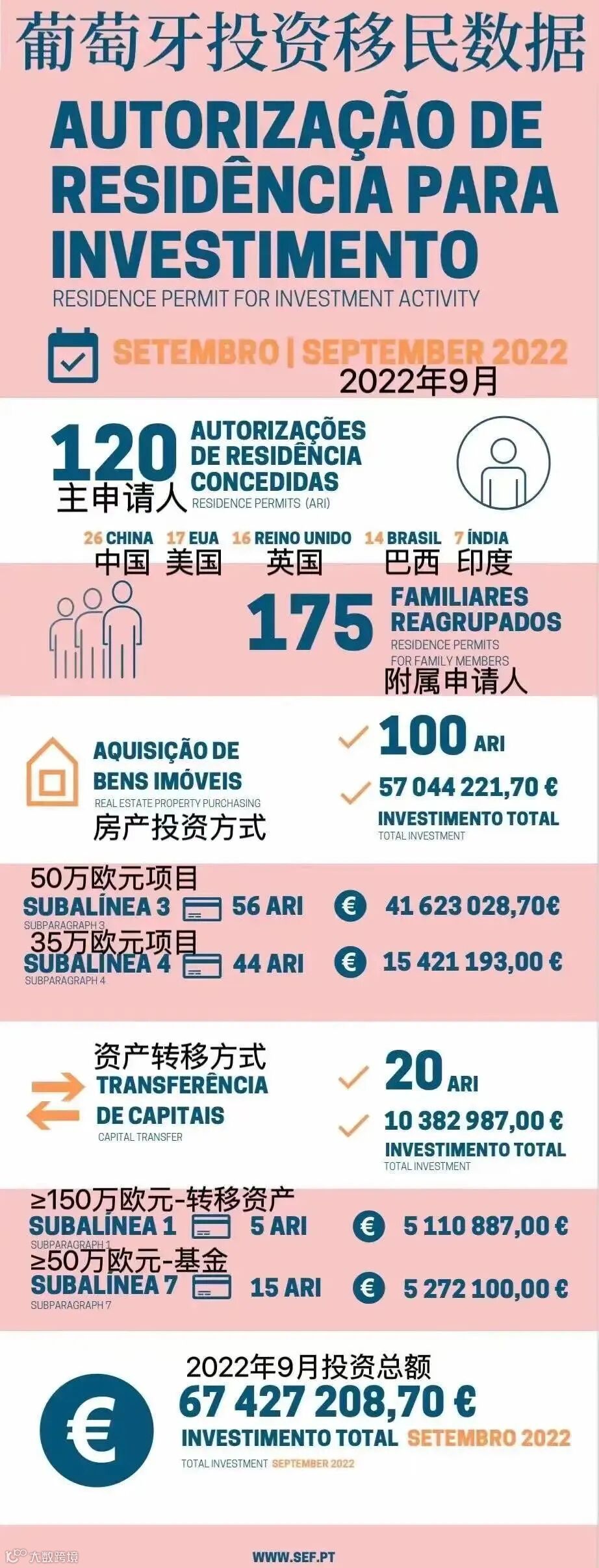 其中2022年9月份,共有120位主申请人和175位附属申请获批葡萄牙黄金签证,获批总人数为295人。中国申请人获批数持续霸榜,83%申请人选择的房产投资。再次印证了:中国人的投资偏好,房产,房产,房产。好项目不等人,好时机要抓住,投资葡萄牙正当时!