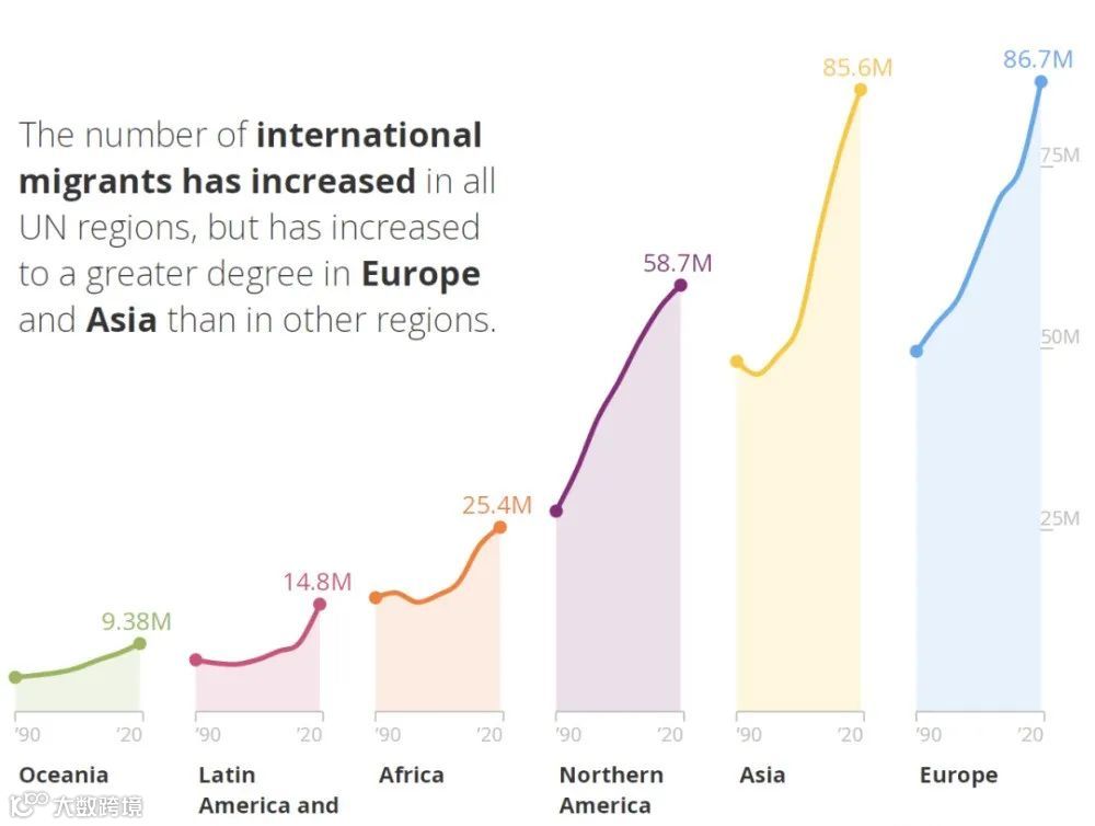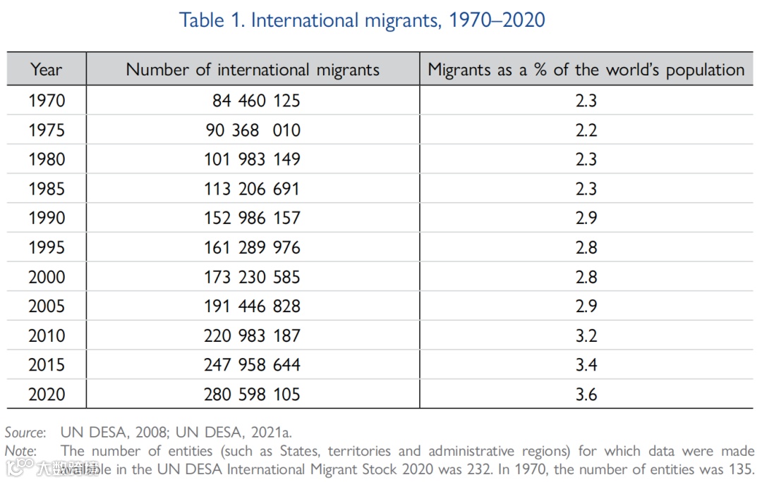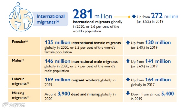 同时在与50年前(1970年)的移民总量(8400万人)数据纵向对比显示,2020年的移民总量(2.81亿人)增加了近3倍多。