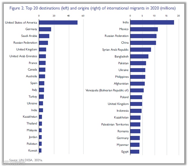 而在移民流出国方面,印度依然以1800万人数高居榜首,中国则成为第四大移民流出国,约有1000万人加入国际移民的行列。
