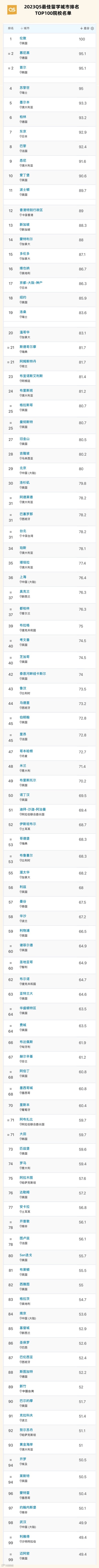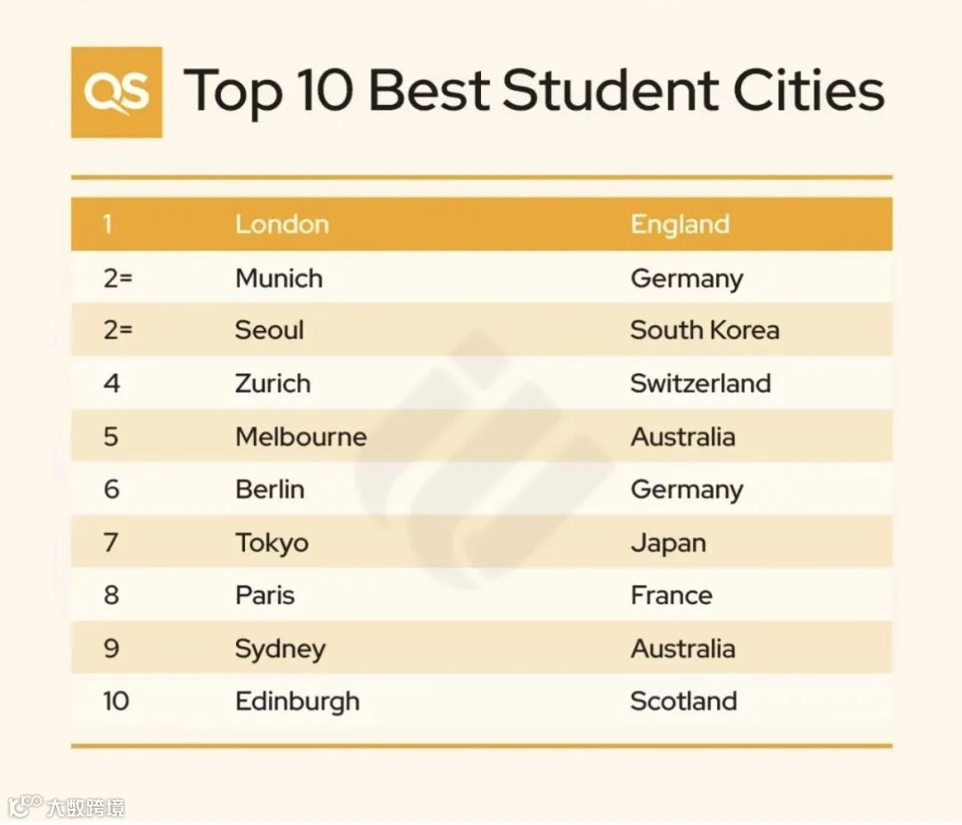 全球十佳留学城市中,英国、德国和澳大利亚分别拥有两所,首尔、瑞士、日本、法国各一所上榜。