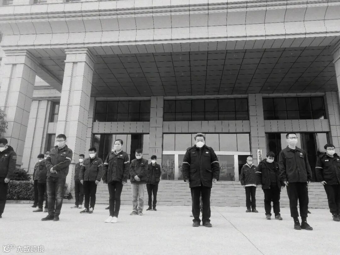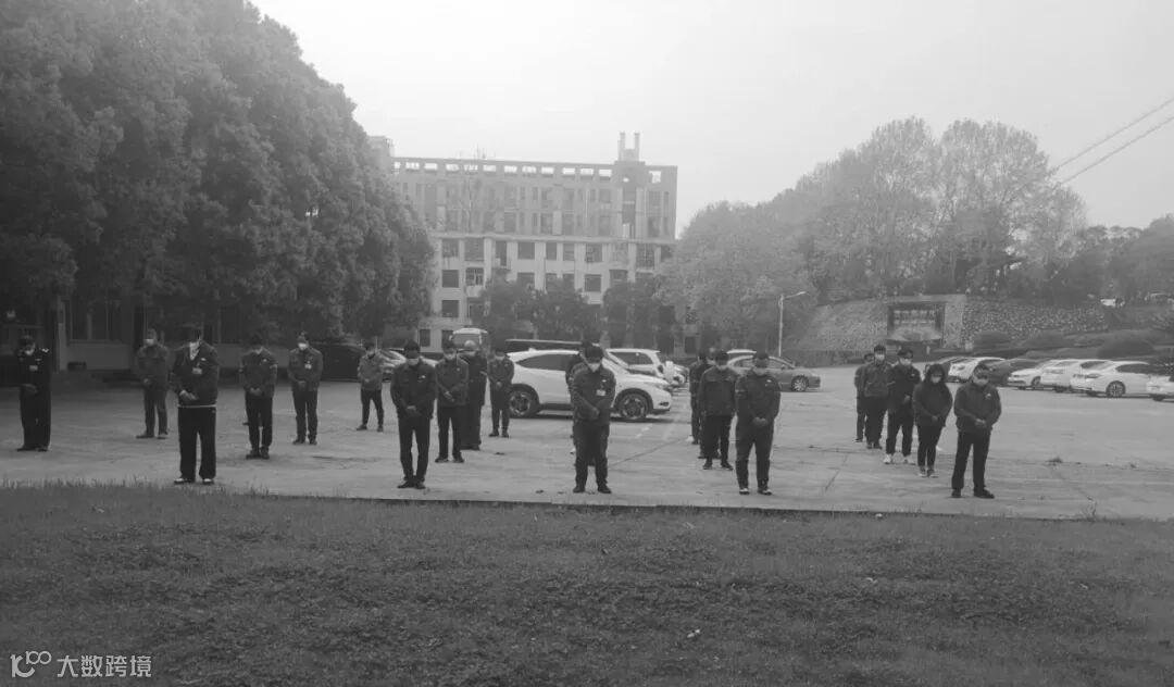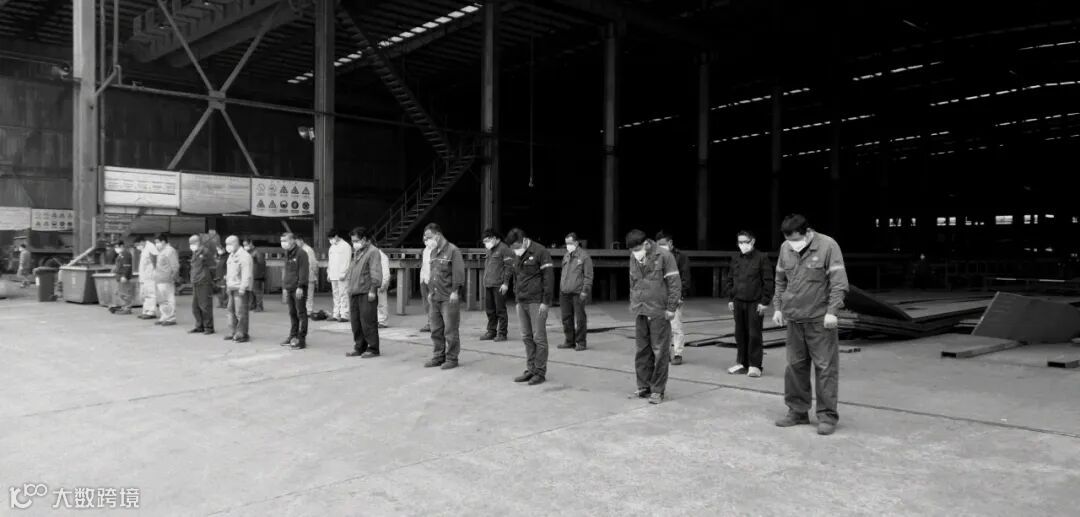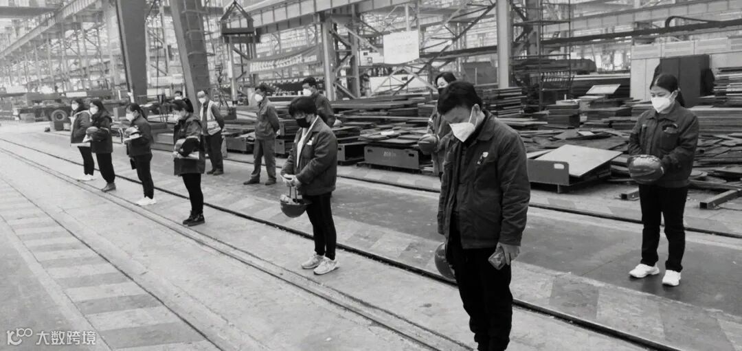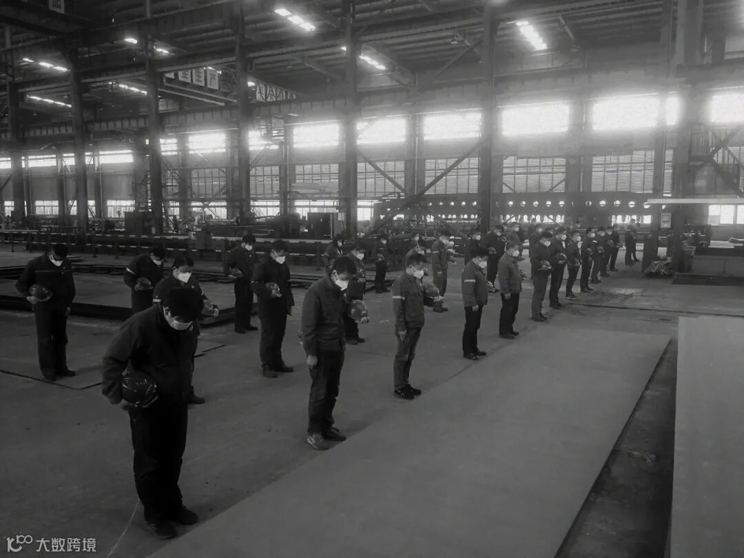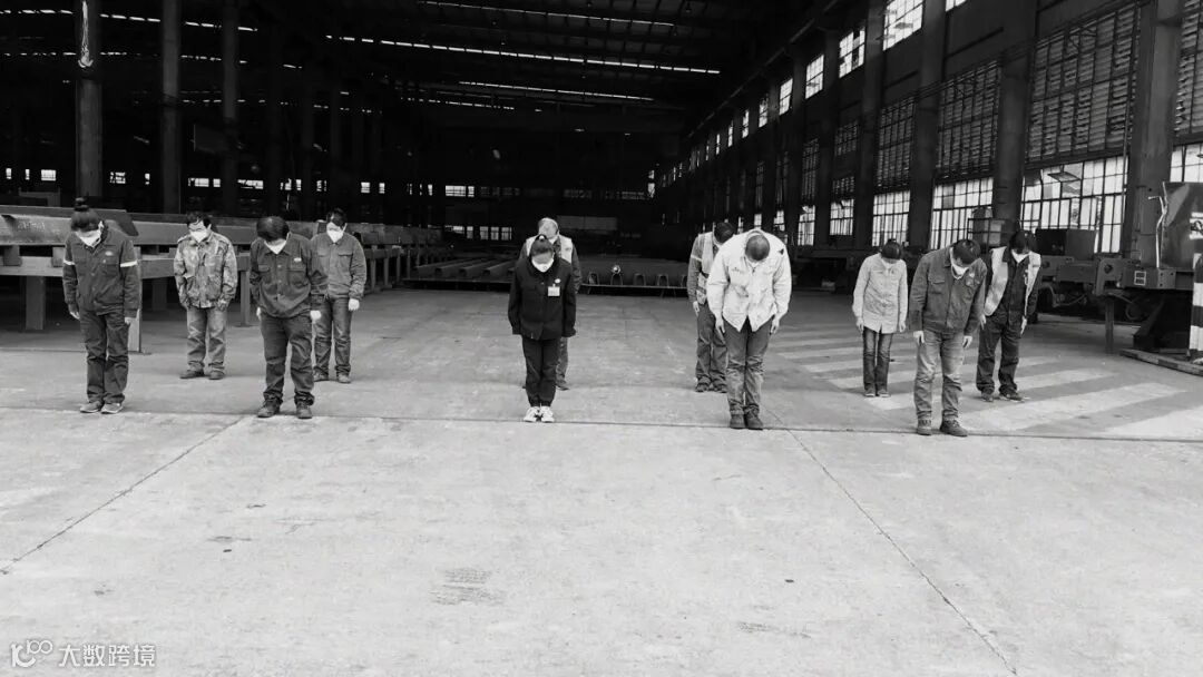 上午10时,厂区内在岗职工原地默哀三分钟,汽车、厂内外试验试航船舶鸣笛。下沉社区服务武船党员原地默哀。居家职工起立致哀。