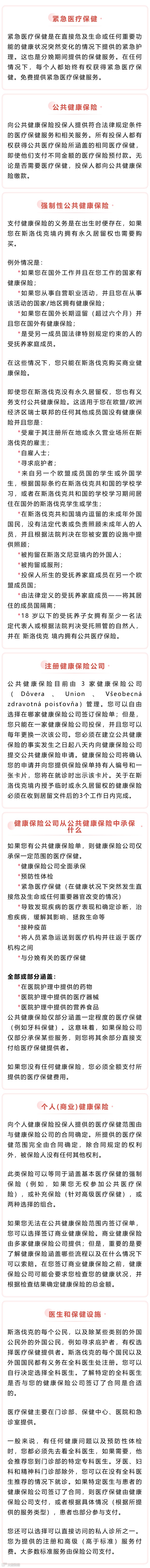 斯洛伐克的医疗保健是根据公共健康保险或个人(商业)健康保险,或欧盟/欧洲经济区瑞士联邦另一个成员国的外国人的健康保险提供的。此外,所提供的医疗保健范围取决于健康保险的类型。每个在斯洛伐克逗留的外国人都必须拥有在斯洛伐克共和国境内有效的某种类型的健康保险。