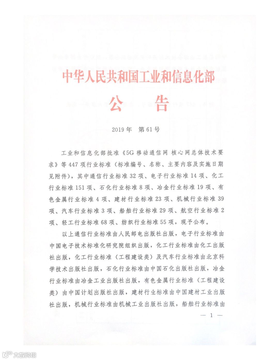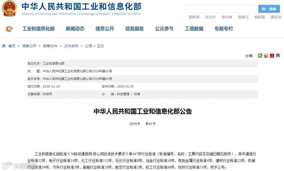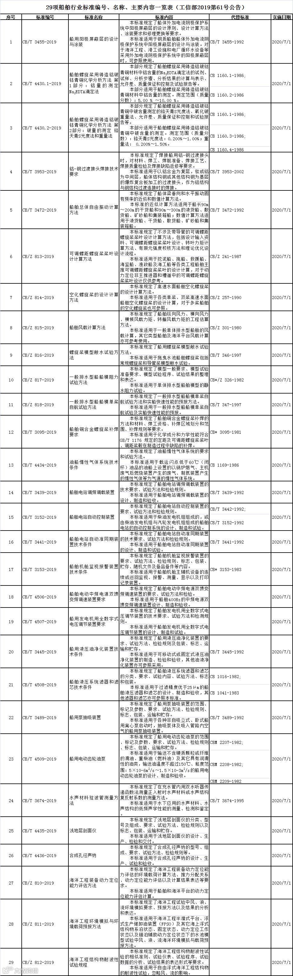 近日,工业和信息化部发布2019年第61号公号,批准《5G移动通信网 核心网总体技术要求》等447项行业标准,其中船舶行业标准共29项,包括新制定项目7项,修订项目22项,主要涉及船用材料、建造工艺、船舶设计与试验、电气、机械设备、声学、海工结构物等领域,详见下图