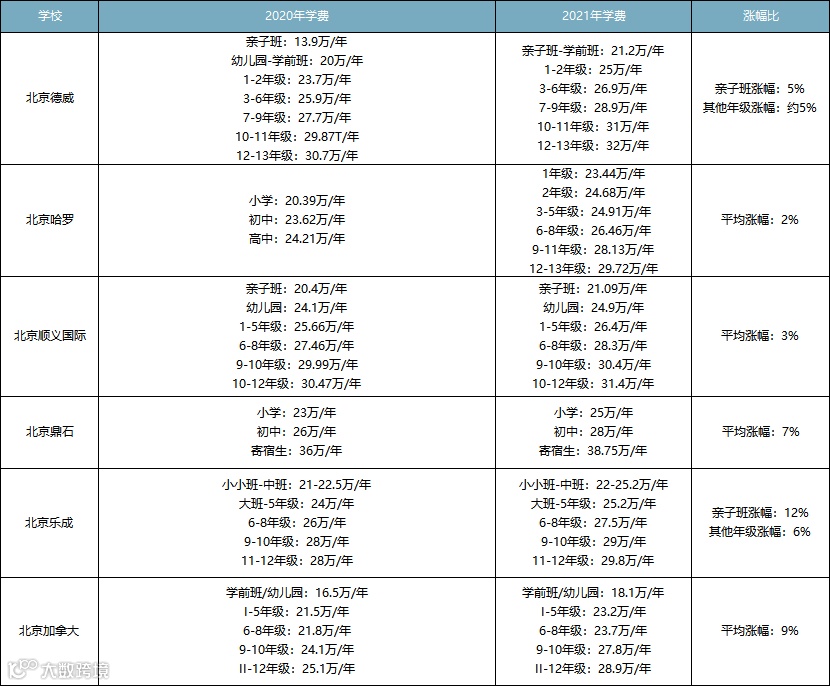 而北京这边,热门国际学校的学费每年涨幅还是非常大的,以德威和鼎石为例,这两所学校曾经位列北京国际学校最贵榜首,2021年的学费涨幅在5%-7%。