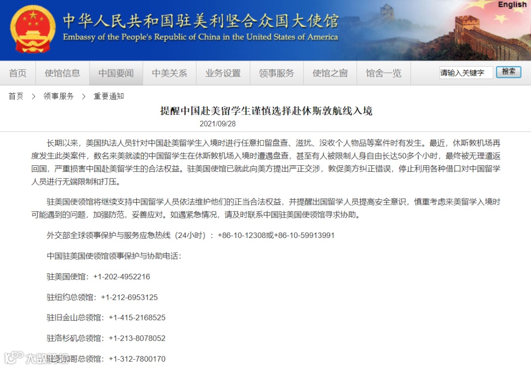 导读:中国驻美国大使馆9月28日发表一份重要通知,提醒赴美留学生谨慎选择休斯顿海关入境,因为已经不止一个留学生在休