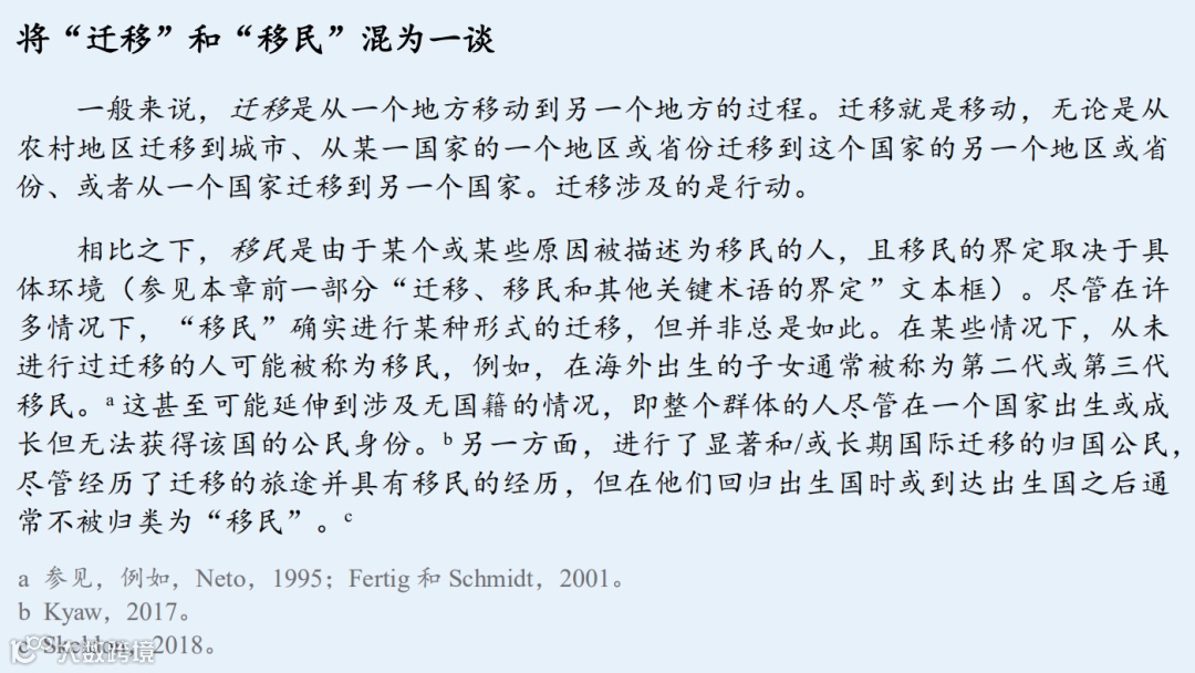 第三,正如本章前面“迁移、移民和其他关键术语的界定”文本框中所指出的,根据适用环境 的不同,必然存在不同的定义。例如,在某些法律/政策情境下,以及在一般性讨论中,“移民”可 以包括从未发生迁移的人。参见下面文本框中关于将“迁移”和“移民”混为一谈的常见问题的讨 论。第三,正如本章前面“迁移、移民和其他关键术语的界定”文本框中所指出的,根据适用环境 的不同,必然存在不同的定义。例如,在某些法律/政策情境下,以及在一般性讨论中,“移民”可 以包括从未发生迁移的人。参见下面文本框中关于将“迁移”和“移民”混为一谈的常见问题的讨论。
