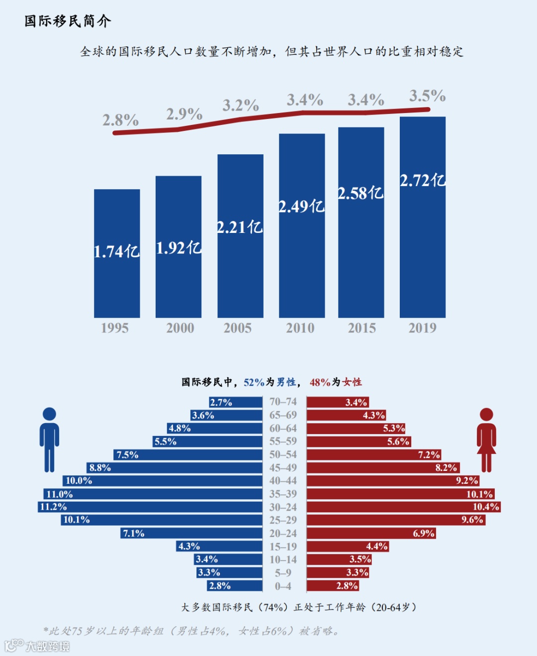 2019年,大多数国际移民(约占总数的74%)正处于工作年龄(20-64岁),而在2000至2019年 间20岁以下的移民比例略有下降(从16.4%降至14%),自2000年起65岁以上国际移民的比重则一直 保持稳定(约为12%)。