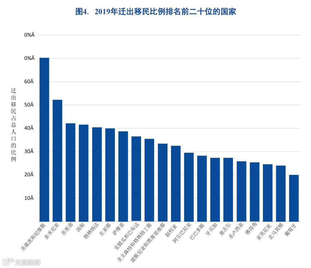 尽管国际移民可能倾向于被高收入国家吸引,他们在全球的起源是多种多样的。一些移民来源 国出于当代或历史中的经济、政治、安全、贸易或文化原因,国民居住在国外的比例很高。例如, 因长期冲突造成的流离失所使阿拉伯叙利亚共和国的迁出移民比例高于其他大多数国家(更多信息 请参见下文关于难民的讨论)。图4突出显示了2019年迁出移民比例较高的国家。重要的是,一个 国家迁出移民的比例代表了移民(和流离失所)随着时间推移(有时是数十年)的积累。值得注意 的是,图4中各个国家的地理多样性(包括了除北美外所有区域的国家)以及来自拉丁美洲和加勒 比海地区的国家数量众多(20个国家中有10个)。