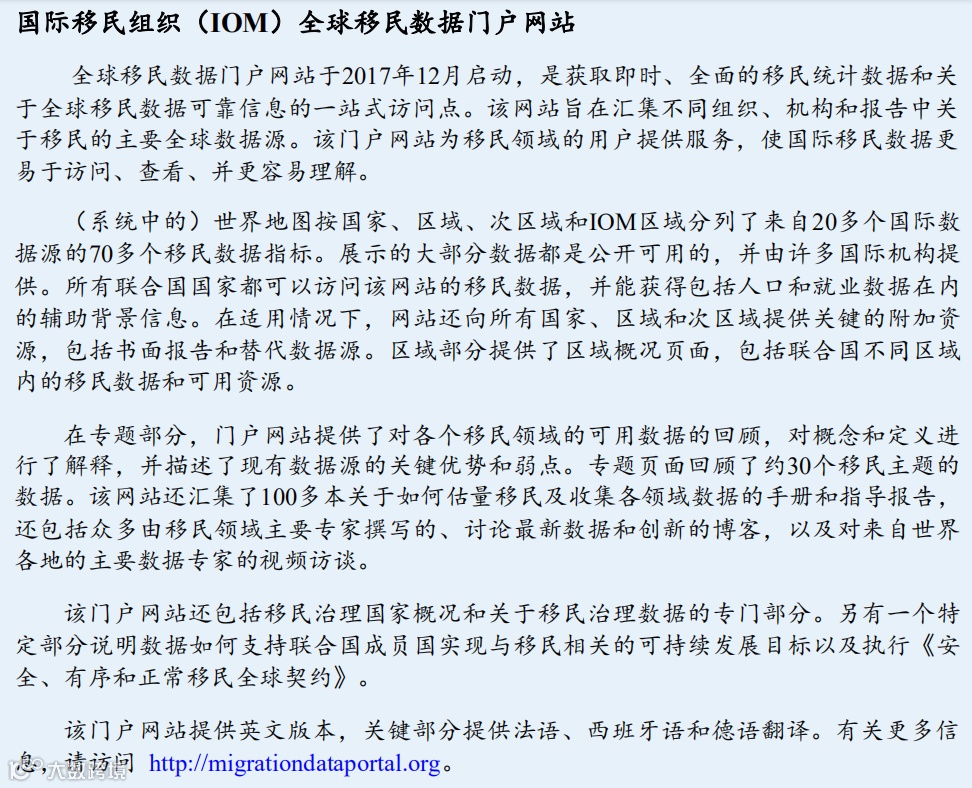 目前主要有两个关于国际移民流动的国际数据库,均来自国家统计数据,包括联合国经社部 (UN DESA)的国际移民流动数据库和经济合作与发展组织(OECD)的国际移民数据库。自2005 年起,联合国经社部依据能获得的各国统计数据对进出特定国家的国际移民流动数据进行了整理。在撰写本报告时(2019年8月),联合国经社部的移民流动数据库尚未更新,最新的数据库为2015 年版本,包含了来自45个国家的数据(仅43个国家有移民迁出数据),高于2008年的29个国家和 2005年的15个国家。