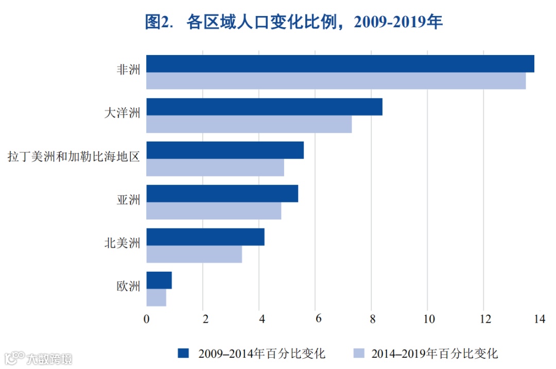 随着时间的推移,一些地区国际移民的增加对人口变化产生影响。图2显示了2009至2019年间世 界六个区域中每个区域的人口变化比例。虽然欧洲历来是国际移民的主要目的区域之一,但在此期 间,其人口比例变化率最低,仅略高于1%。然而,若没有国际移民来缓解一些欧洲国家由于人口出生率下降等原因导致的人口减少,这个比例可能会低很多。相比之下,由于高生育率和寿命的延 长,非洲经历了最显著的人口比例变化,在此期间人口增长近30%。尽管如此,非洲迁出到其 他区域(即欧洲和亚洲,详见本报告第三章讨论)的移民使其人口增长有所减缓。