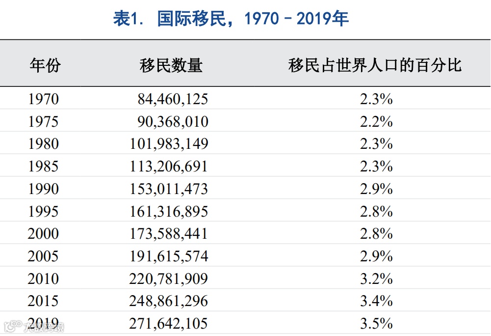 总体来说,在过去五十年中,据估算,国际移民数量有所增加。2019年居住在出生国以外国家 的人数约为2.72亿,比1990年多了1.19亿人(当时为1.53亿人),为1970年估计人数(8400万人,见 表1)的三倍以上。虽然全球国际移民占世界人口的比例在此期间也有所增长,但很明显的,绝大多 数人继续生活在他们出生的国家。