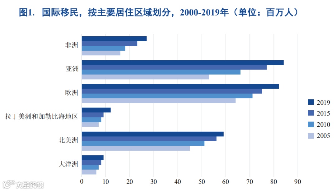 2019年,欧洲和亚洲分别接纳了8200万和8400万国际移民,共占全球国际移民总数的61% (见图1)。北美紧随其后,2019年国际移民数量达到5900万人,占全球移民总数的22%。在其 他区域,拉丁美洲和加勒比海地区(接纳移民数量的全球)占比为10%,大洋洲为3%。同每个 区域的人口数量相比,2019年国际移民比例最高的是大洋洲、北美洲和欧洲,国际移民数量分 别占相应地区总人口数量的21%、16%和11%。8 相比之下,亚洲、非洲(分别为1.8%和2%)以 及拉丁美洲和加勒比海地区(1.8%)的国际移民比例相对较低。然而,亚洲是2000至2015年间 移民人口增长最显著的区域,人数增长比例达到69%(按绝对值计算,移民增加数量为2500万 人)。9 在此期间,欧洲经历了(国际移民数量的)第二大增长,国际移民数量增加了2500万人, 紧随其后的是增加了1800万国际移民的北美洲,以及增加了1100万的非洲。
