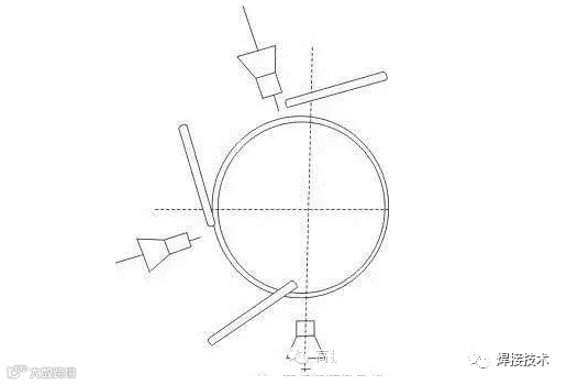2.2 在钟表12点、4点、8点三处进行定位焊接,每段定位焊缝的长度为10mm左右,焊缝厚度控制在2mm左右,根部定位焊缝是焊缝的一部分,工艺要求与正式焊接时相同,以防止产生裂纹及焊接过程中收缩变形量过大。