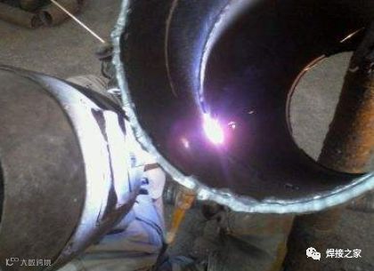 3.3 送丝:应使焊丝始终位于钨极的前方,边熔化边送进,要注意焊丝和焊枪的角度,以免钨极碰上焊丝和管壁造成“打棒”及夹钨现象,送丝动作要轻柔,不得搅动氩气保护层,以防止空气侵入熔池,影响保护效果。