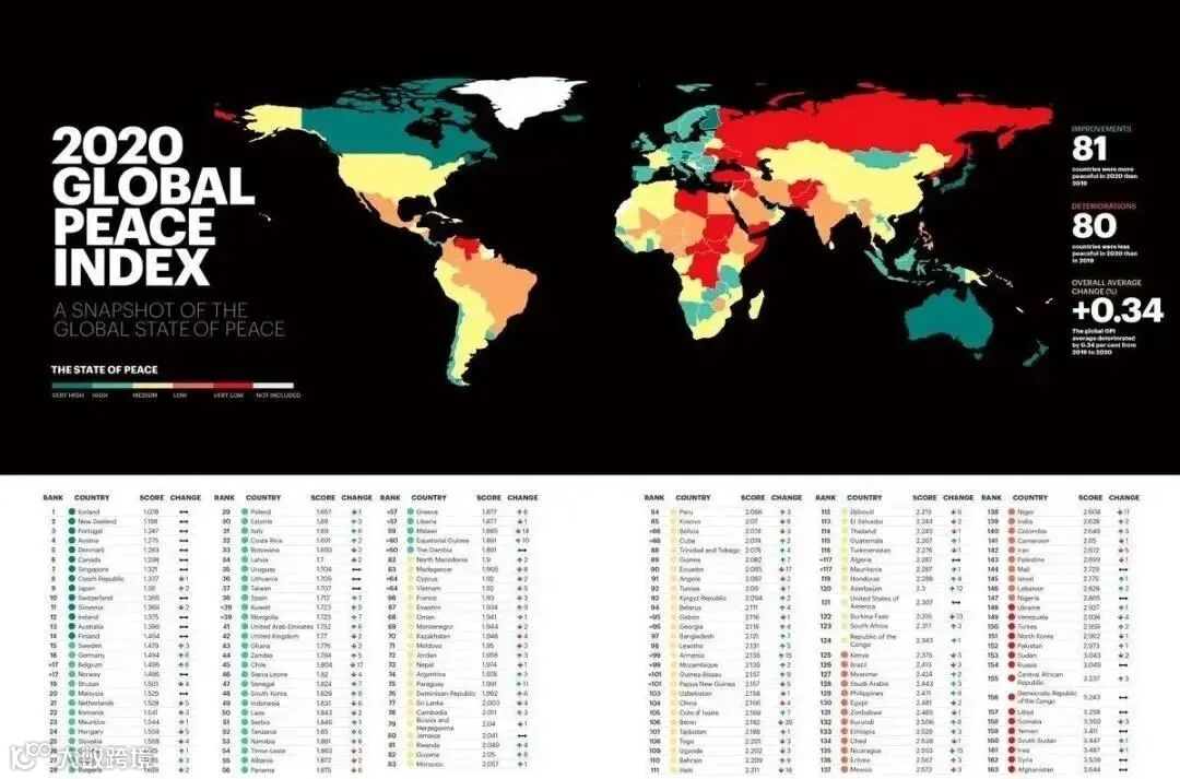由经济与和平研究所发布的《全球和平指数》报告对163个独立国家和地区进行了评级,冰岛,新西兰和葡萄牙是世界上最安全,最和平的三个国家。葡萄牙的安全指数排名全球第三位。经济和平研究所测评得出了2020年的全球和平指数,并与2019年的数据进行对比后得出了这样的结论。这项排名的得分由各个国家的内外部冲突率,安全率,军事化程度等23项指标衡量。在欧洲范围内,葡萄牙仅次于冰岛,优于奥地利,成为了欧盟中最安全的成员国。
