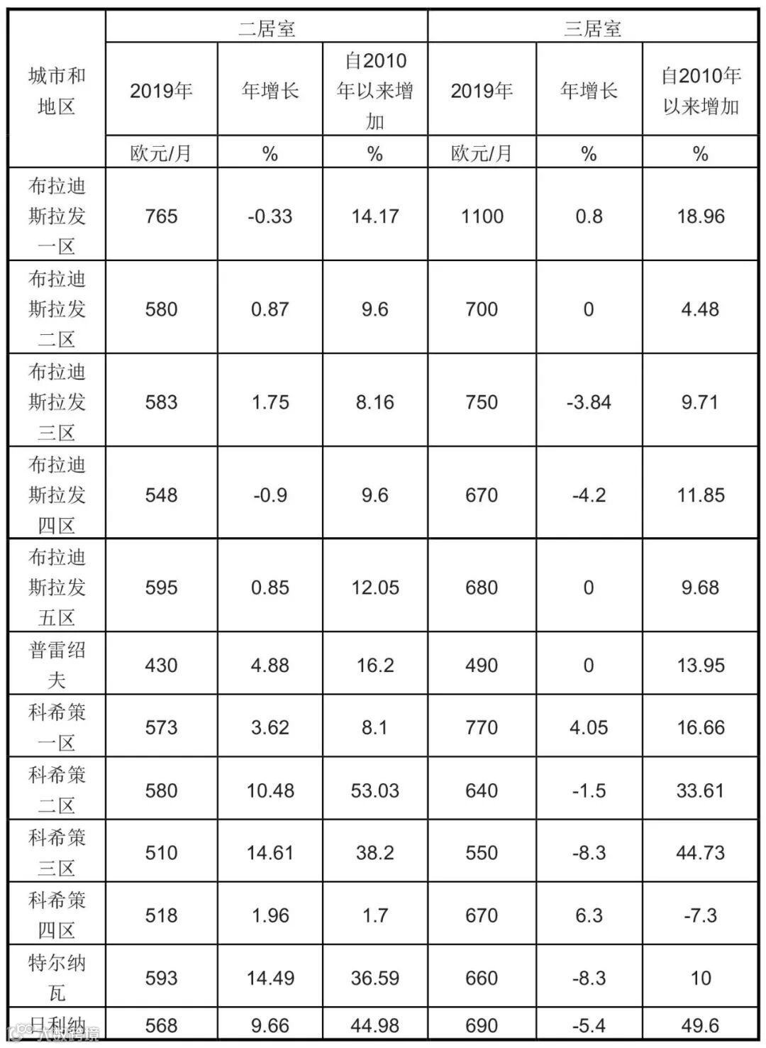 【租金】2019年斯洛伐克主要地区和城市住房租金如下: