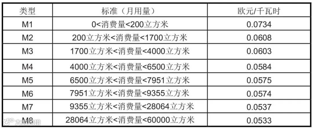 斯洛伐克家庭用燃气资费(2018年12月1日起)