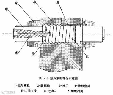 液压紧配螺栓是一种带有可扩张中间锥套的紧配螺栓,它由带斜锥套的杆身和具有相应圆锥内孔的中间锥套以及两只螺母组成。它利用过盈紧配合的轴向力使得法兰面产生摩擦力传力,所以其传递扭矩的形式是通过两方面来实现的,一是依靠螺栓在螺孔中的膨胀所产生的抗剪力;二是依靠螺栓预紧力所产生的法兰面间的摩擦效应,这样使得联接更可靠。它的最大优点是:结构简单,拆装方面。由于安全系数和强度的提高,与传统的紧配螺栓联接相比,在直径和数量上可以减少,相应法兰的直径也可减少,从而使联轴器更为紧凑,费用减少。缺点是液压紧配螺栓的材料要求较高,配合面间的加工精度要求较高,拆装时需要专用高压油泵和配套工具,有较高的安装技术要求,这使得其在应用上受到一定程度的限制。