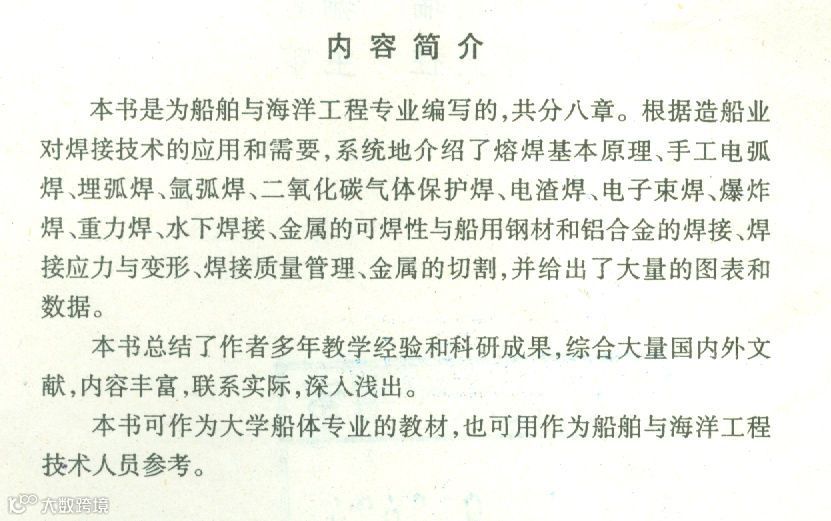 本书是为船舶与海洋工程专业编写的,共分八章。根据造船业对焊接技术的应用和需要,系统地介绍了熔焊基本原理、手工电弧焊、埋弧焊、氩弧焊、二氧化碳气体保护焊、电渣焊、电子束焊、爆炸焊、重力焊、水下焊接、金属的可焊性与船用钢材和铝合金的焊接、焊接应力与变形焊接质量管理、金属的切割,并给出了大量的图表和数据。