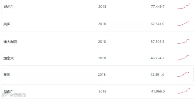 近年来,爱尔兰人均GDP不断增长,根据2018世界银行最新数据显示,爱尔兰人均GDP全球排名第九,数值为77,449.7,人均GDP远超美国、加拿大和澳洲,在六大英语国家中排名第一。