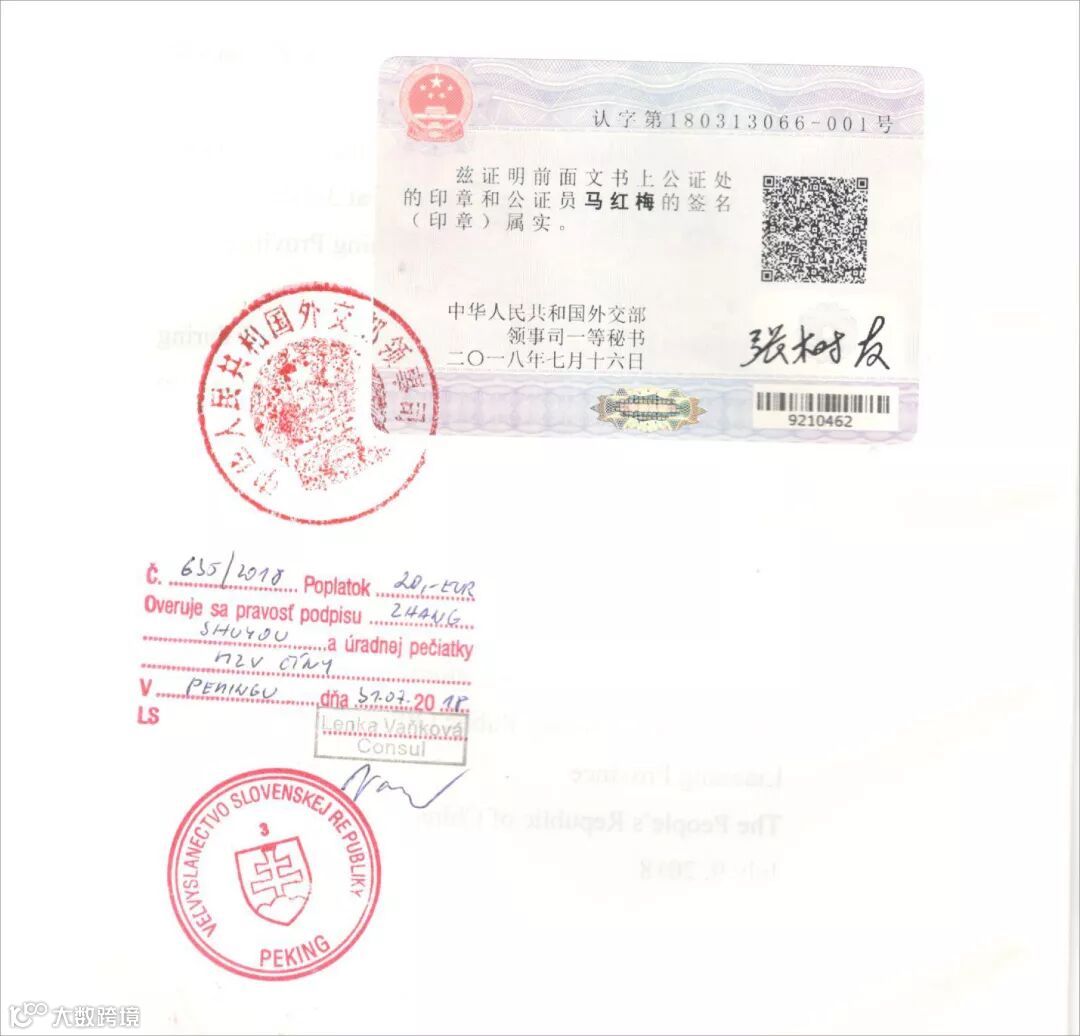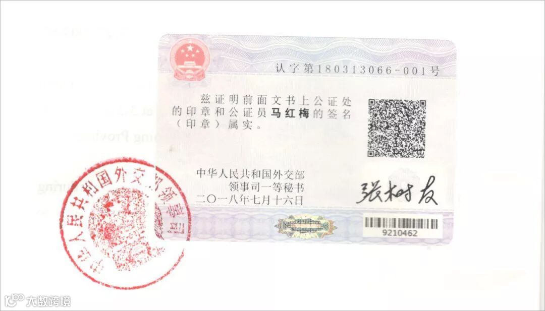 第二步办理好公证书就开始递交外交部认证,由外事办或者外交部办理(普通件:5个工作日,加急件:1-2个工作日),外交部认证是在文件背面的上方位置完成盖印,俗称“单认证”。