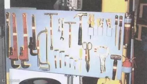看下图,此工具5S管理,画了工具的行迹,少了工具一眼就能看的出来。