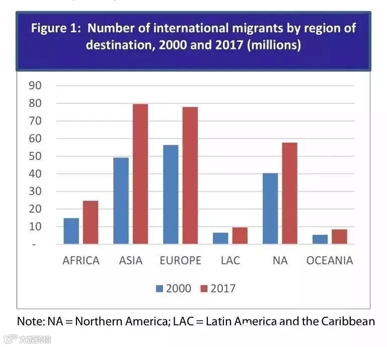 从2000年到2017年,国际移民来自亚洲的比例从38%增加到41%。