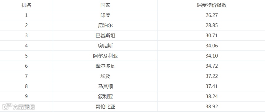 5.印度、埃及在世界范围内排名最低,消费者物价指数在40以下。