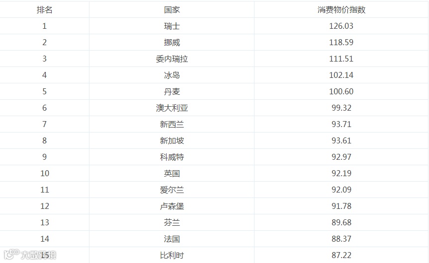 2.日本、韩国的物价最高,消费指数在90-100之间,和欧洲国家爱尔兰、 意大利等国物价持平。