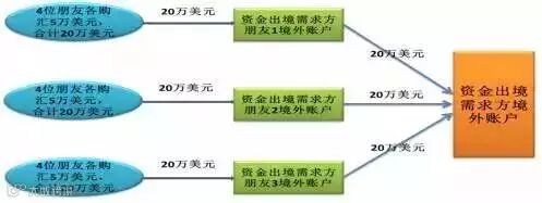资金出境需求方请3位亲友各自在境外开设一个境外账户,每位亲友再邀请4位朋友(避免上述5人的监管要求)各购汇等额5万,总金额不超过20万美金,汇至3为朋友的境外账户,如此,3为朋友每人境外账户中各汇集20万美金,合计60万美金,将该60万美金再汇集到资金出境需求方账户,用作海外投资。然而,此等操作实质上为变相分拆结售汇,存在合规性风险。