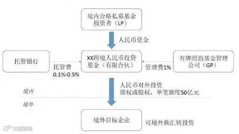 由具有资质的发起人发起设立的人民币国际投贷基金,以债权或股权的方式直接进行境外人民币投资,无需履行换汇手续,便利快捷。目前大概有7家机构获得跨境人民币投贷基金管理公司牌照,分别位于上海、山东、广西各1家,云南4家。跨境人民币投贷基金系以人民币实现资金出境的方式,总额未设置上限,单笔额度不超过50亿美元,一定程度上可以规避外汇管控,可在境外换汇转为投资。下图系跨境人民币投贷基金的基本运作模式: