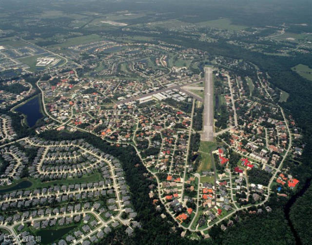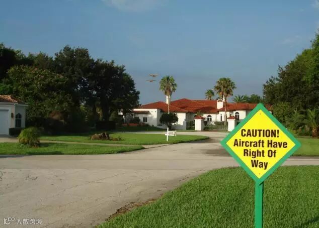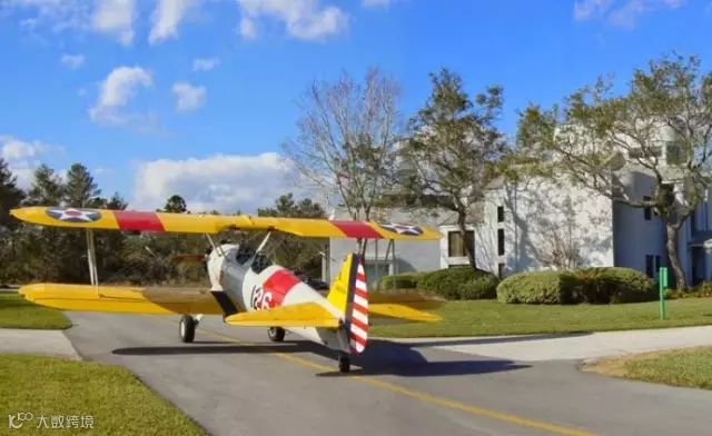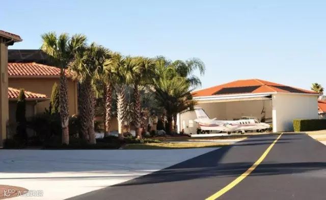 屋门前的大道整齐宽阔,并直通毗邻小区的一条修葺完整的飞机跑道。当地居民或是把飞机停在房屋门前或是车库内。