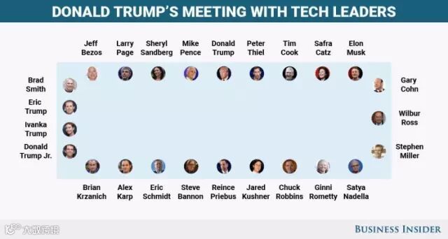 美国市值最高的三家公司:苹果、Alphabet(谷歌)和微软的CEO们都来了,但是他们并没有被安排坐在特朗普的身边。相反,座位离特两普最近的,是副总统Mike Pence和彼得·泰尔。我们知道彼得·泰尔是在大选期间公开支持特朗普的硅谷高管,看来特朗普并不吝惜在公开场合对他的看重。