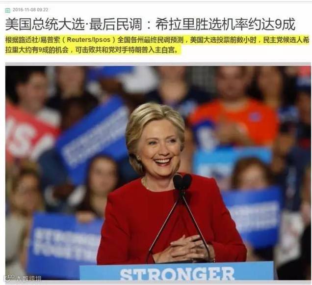 不过希拉里没有说,在选前头一天,还领先川普13%民调优势,胜率高达9成。