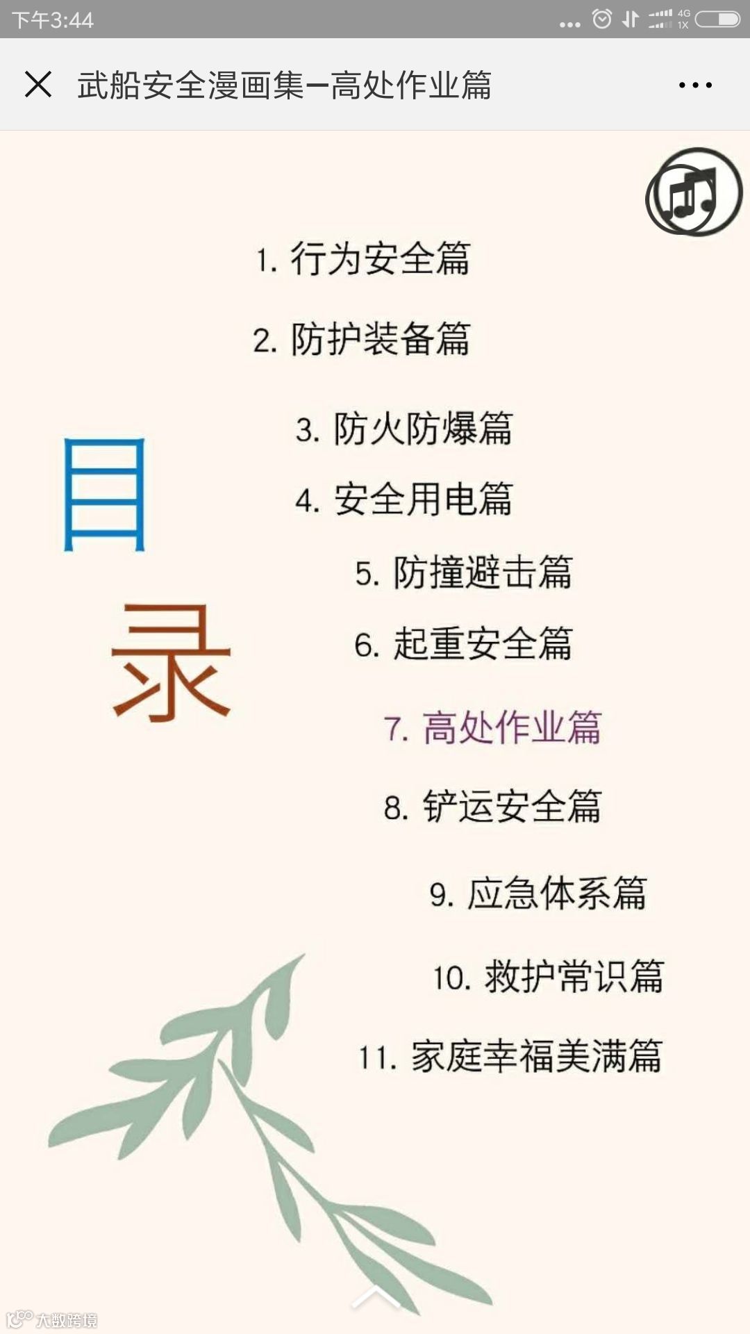 武船集团采用现代安全管理方法,持续改进安全培训方式,以目视化安全漫画的形式宣传安全知识,此《武船安全漫画集》H5秀共分为11个篇章分次推送,从人员行为规范、劳动防护装备、危险作业安全等几个方面,介绍公司安全行为规范与安全知识,警示不安全行为,推广安全文化。