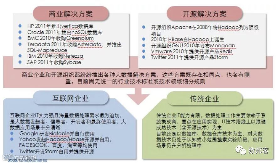大数据正成为IT行业全新的制高点,各企业和组织纷纷助推大数据的发展,相关技术呈现百花齐放局面,并在互联网应用领域崭露头角,具体情况如下图四所示: