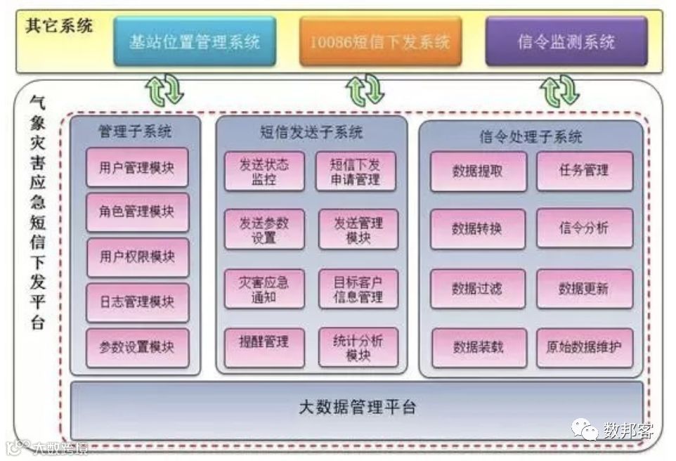 系统主要由信令处理子系统、短信发送子系统、管理子系统、大数据管理平台四部分组成。
