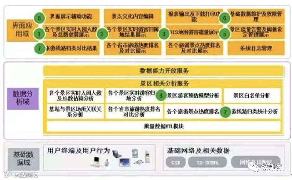数据处理层采用专用数据统计算法和数据发掘分析技术,根据实时采集到的信令接口数据,及定期更新的基站、小区、场所及号码段数据,综合分析各个视角的数据,包括统计区域实时流量数据、流量总量数据、流量密度数据、流量驻留数据、景点流量告警等。