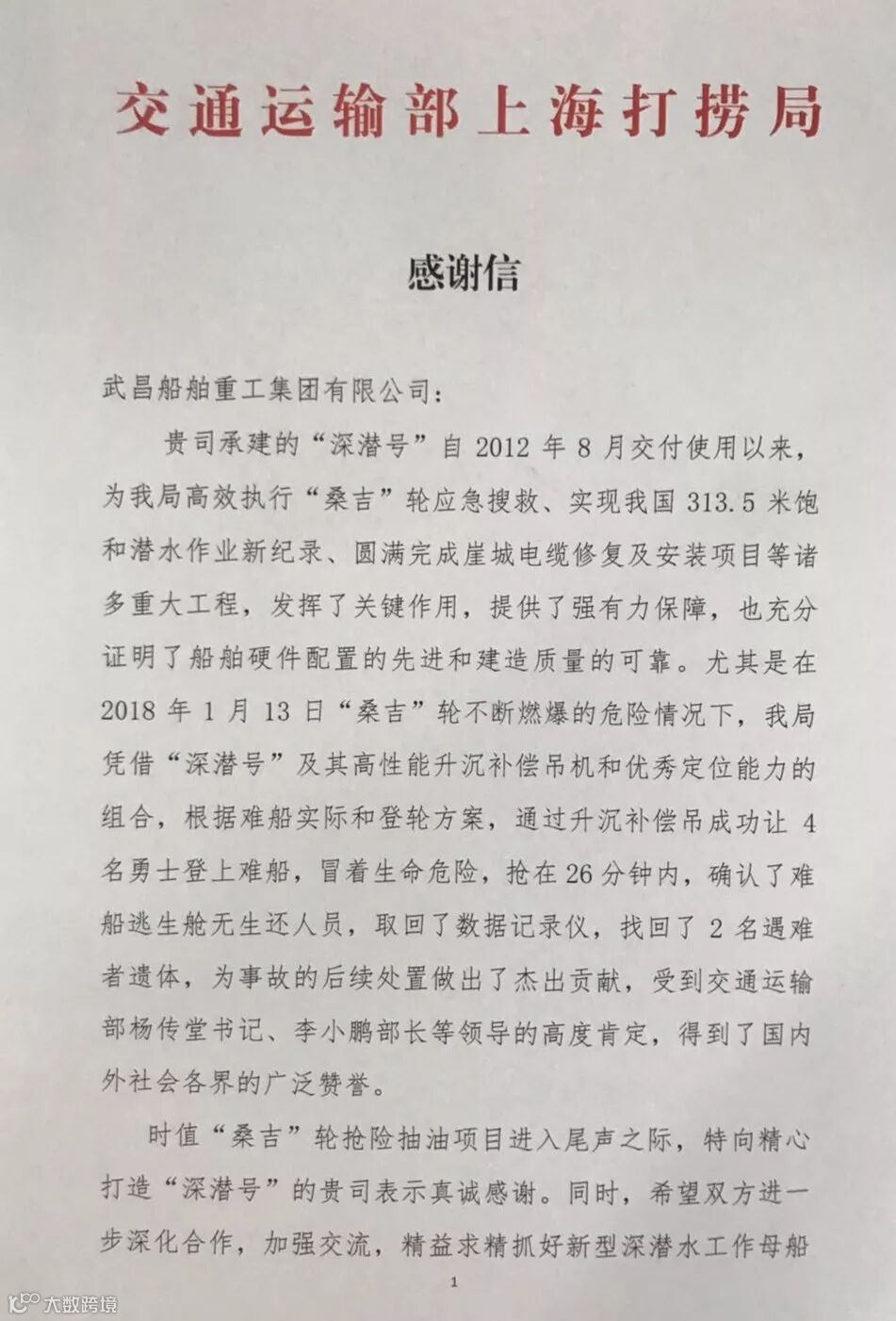 由武船集团为交通部上海打捞局建造的“深潜号”深潜水工作母船,自2012年8月交付以来,为船东执行多项重大工程,发挥关键作用,充分证明了该船硬件配置的先进性和建造质量的可靠性。尤其是在2018年1月13日“桑吉”轮抢险项目中,凭借着“深潜号”及其高性能升降补偿吊机和优秀定位能力的组合,为事故的处置做出了杰出贡献。凭借着该船优异的实际表现,船东特发来感谢信对武船集团表示肯定。