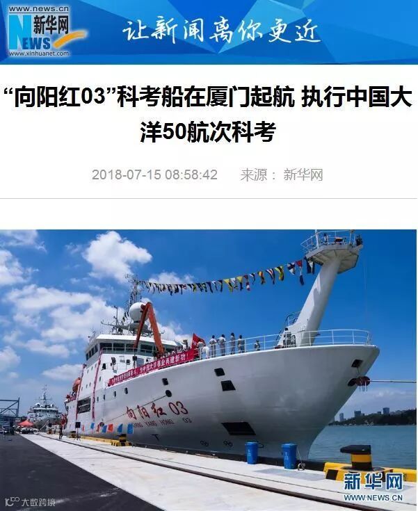 各大媒体纷纷报道的正是“向阳红03”船出发的消息——7月14日,搭载着中国大洋50航次科考队的“向阳红03”船从厦门起航。