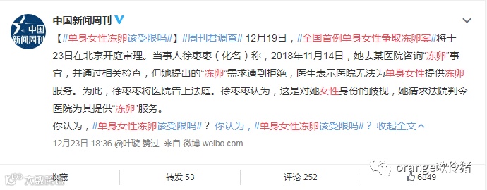 23日,全国首例单身女性要求冻卵的一般人格权纠纷案在北京市朝阳区法院开庭,原告徐女士称:2018年11月14日,她去首都医科大学附属北京妇产医院咨询“冻卵”事宜,通过相关检查,但提出的“冻卵”需求遭医生拒绝。遂其将医院告上法庭,认为医院行为是对她女性身份的歧视,请求法院判令医院为其提供“冻卵”服务。医院方称有文件要求,不能给单身女性提供冻卵技术。法院并未于23日当庭宣判。2001年卫生部发布实施的《人类辅助生殖技术管理办法》第三条规定 人类辅助生殖技术的应用应当在医疗机构中进行,以医疗为目的,并符合国家计划生育政策、伦理原则和有关法律规定。