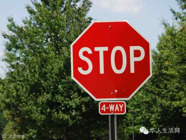 在美国的小街小巷里的十字路口,都竖立一个明显的红色八角型“Stop”。根据路况有的十字路口是四个“停车”标记,有的只有两个,一定要停稳看清楚。这些路口经常是车不多,人也不多,但你必须要完全停下来,左右看,然后再踩油门。即使是路口完全没车没人,也必须停稳,再走。什么点刹一下,不停稳,出溜过去等行为,被警察看到必吃罚单。国内朋友来美国后开车经常吃罚单的就是这种,所以不能掉以轻心。