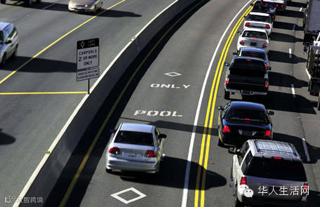 如果车上只有一个人,千万别走Car Pool Line。在美国的高速公路上,有专门辟给那些两个或两个以上乘客走的车道(最里面的车道),也就相当于咱们高速公路上的超车道。如果一个人的车走到这条道上被警察发现,罚款额是341美元!