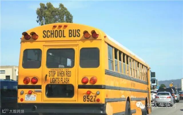 在美国校车为黄色标志,看到校车停下,不管有没有人在那里举着停车标志,一定要停下来等待。一般校车在停车时,都会从车身的侧面伸出一个“STOP”标志。当这个标志出现,前后左右所有的车都必须要完全停住,直到标志收起为止。
