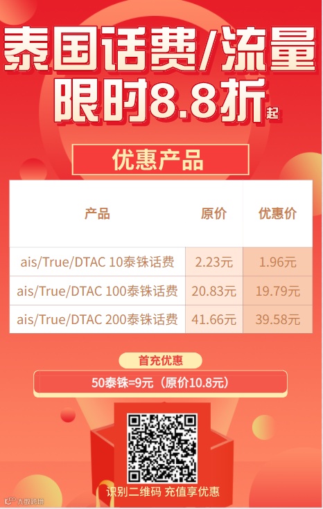 导读:泰国话费流量,识别二维码超值快充!全流程微信操作,方便!快捷!更多套餐优惠,详见充值资费标准 东南亚手机话